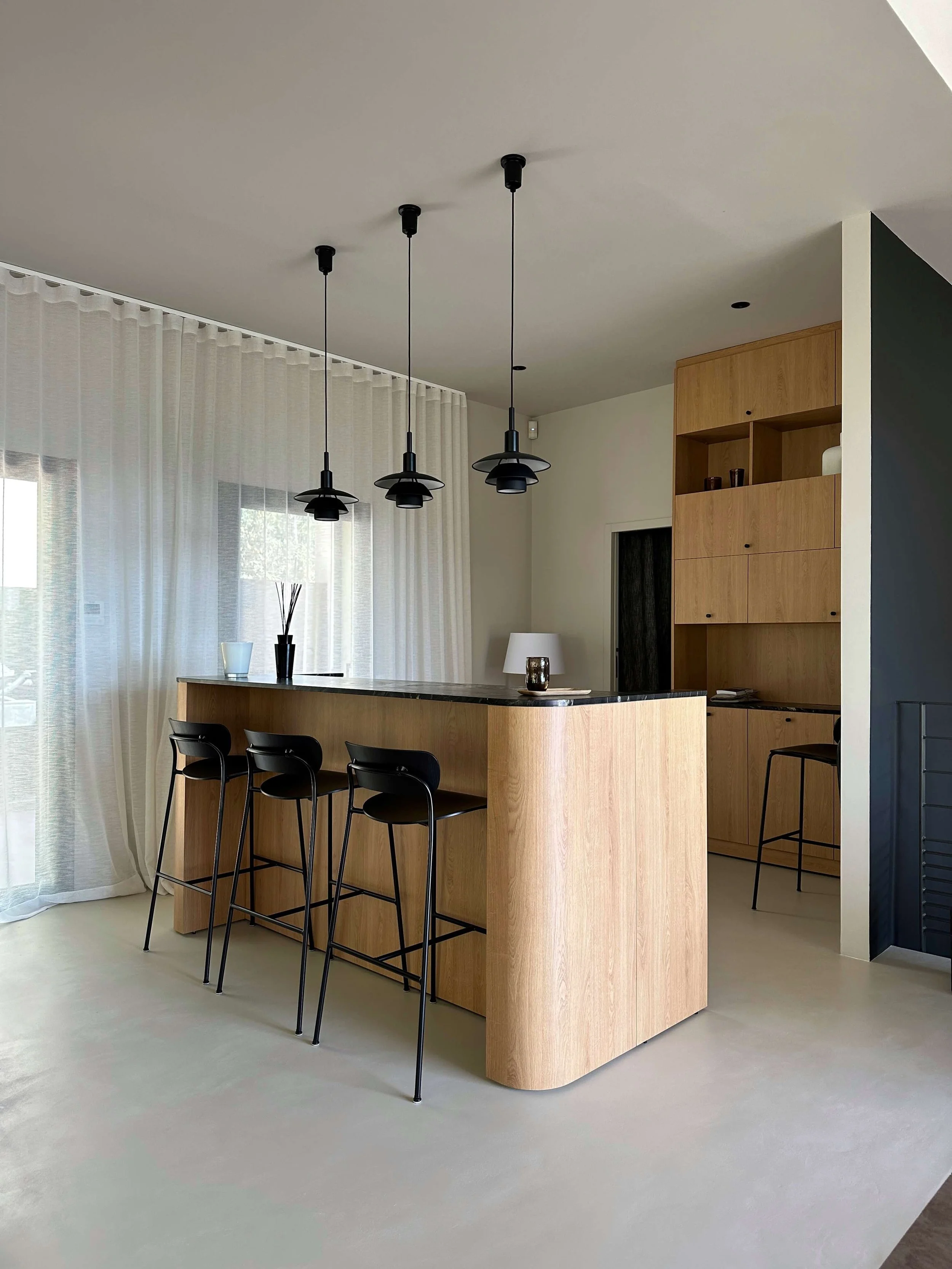 *La première proposition misait sur des tons clairs, notamment pour la pierre et les tabourets. Mais lors de la visite chez le marbrier, un véritable coup de cœur pour un quartzite plus sombre a fait évoluer le projet vers des tonalités plus profondes.